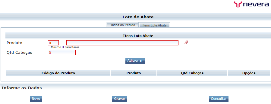 - Então clique na aba itens lote abate, ao lado da aba de preenchimento dos dados do pedido.