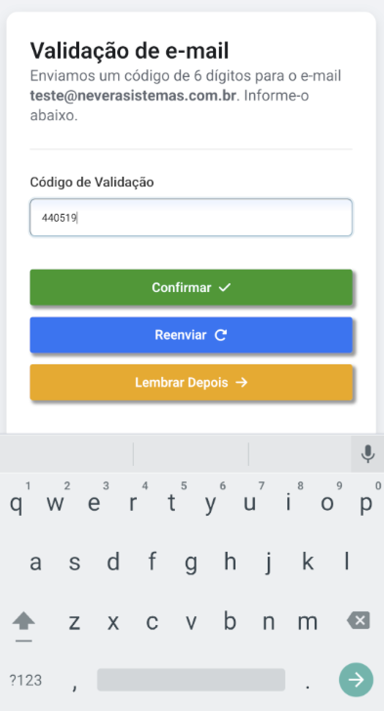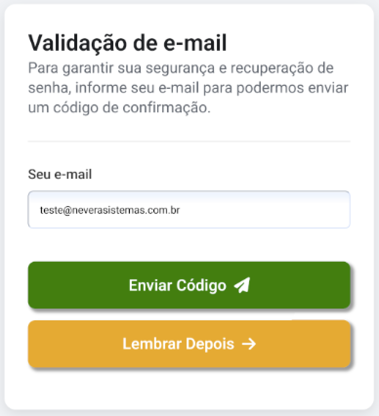 SOBRE: Para conseguir utilizar a opção "Esqueci a senha" disponível na tela de acesso do Nevera Mobile, é necessário que o usuário valide o seu e-mail. Este procedimento será executado apenas uma vez.