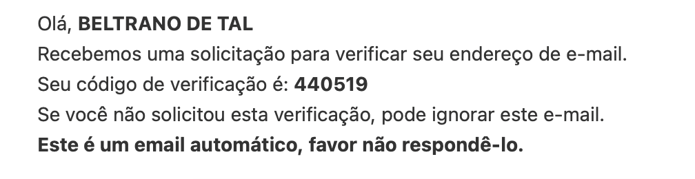 3º Passo - Será enviado um e-mail para o endereço do usuário, com o assunto "Confirmação de e-mail" e o conteúdo com o código de verificação: